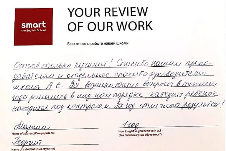 Мой ребенок посещает занятия по английскому языку, главное, что после них он лучше усваивает материал в школе. Мы пришли в SMART именно за помощью в учебе, после уроков у ребенка есть успехи и он вышел на пятерки. Нам нравится все!